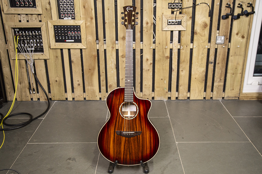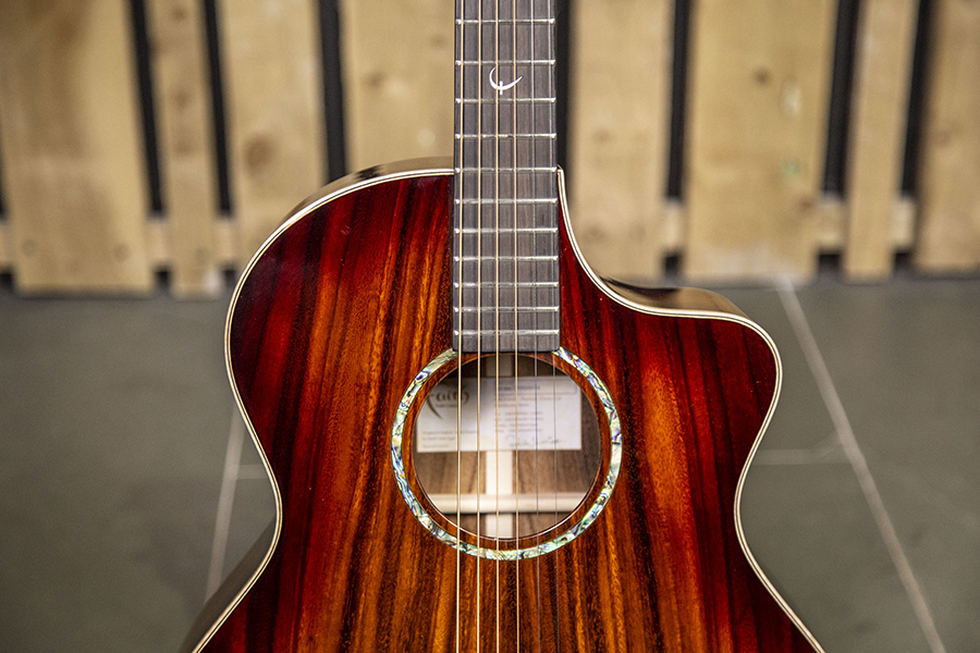 There’s no doubting the special quality of the Neptune Blood Moon from the moment you open the case. As Ben says in his review, this is a simply breath-taking looking guitar with a beautiful Blood Moon burst finish over an Indonesian figured trembesi body – back, sides and top. Trembesi is reckoned to have some of the qualities of koa and mahogany, so when coupled with Faith’s careful design and quality build should provide for an interesting sonic result!