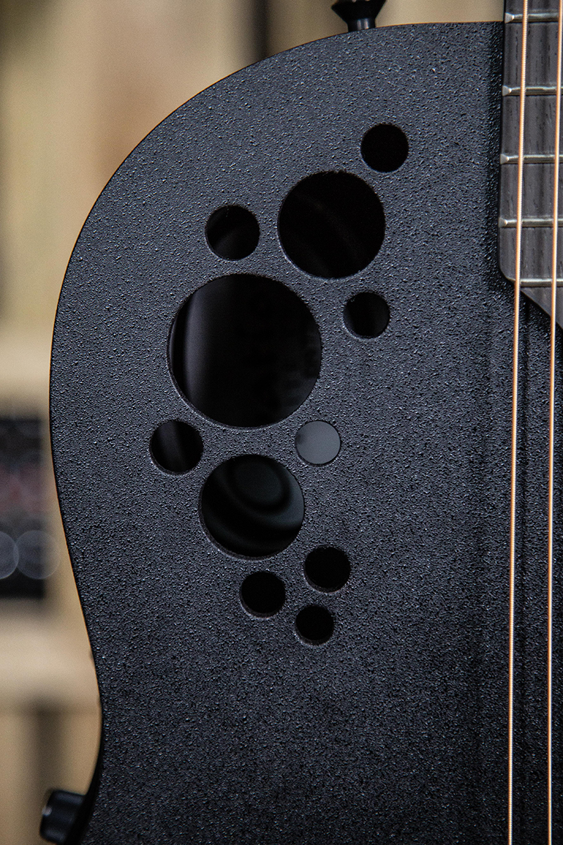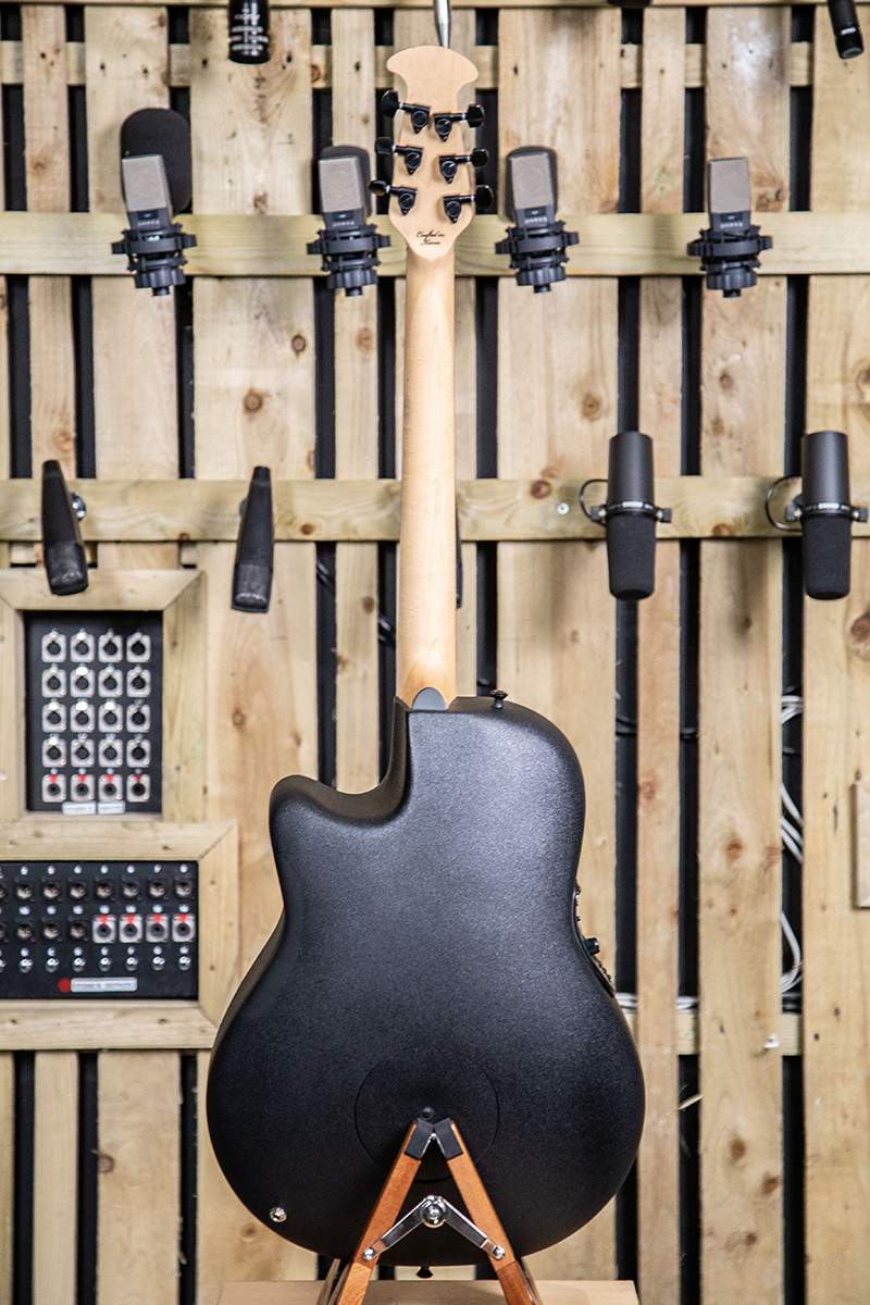 The Ovation we were sent to try is different in many ways from anything we have seen before at AR. To start with, the Sitka spruce top has been finished in a relentless black finish so that you might think it isn’t made of wood at all (in fact, Ovation says it is AA grade solid Sitka). It also is completely free of CITES restrictions, with the top being mated to a Lyrachord back, a maple neck with a wenge fretboard and a walnut bridge. However, probably the biggest difference of all is that it is designed to be tuned down to D. Quite a number of players like to do this but it can cause problems with a guitar that hasn’t been designed to cope with the resulting lower string tension. The result here, however, is a baritone experience from a guitar that doesn’t feel it is fitted with elastic bands instead of strings.