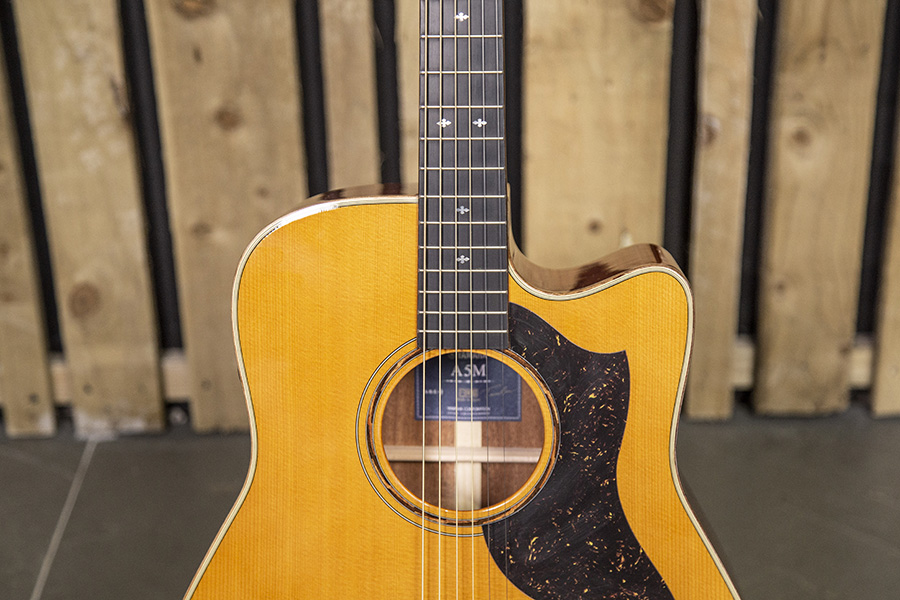 Constructionally, the Yamaha A5M s a very workmanlike Dreadnought/’western’ cutaway with a nicely straight grained Sitka spruce top with a solid mahogany back and sides, The neck is of African mahogany and the fingerboard is ebony. The nut is made from Tusq, as is the saddle, the latter sitting on a handsome ebony bridge. The top, by the way. benefits from what Yamaha calls its A.R.E. process which is its take on torrefaction, the enhanced wood ageing process which is becoming increasingly common and which claims to give a new guitar some of the qualities of an older, played-in model.