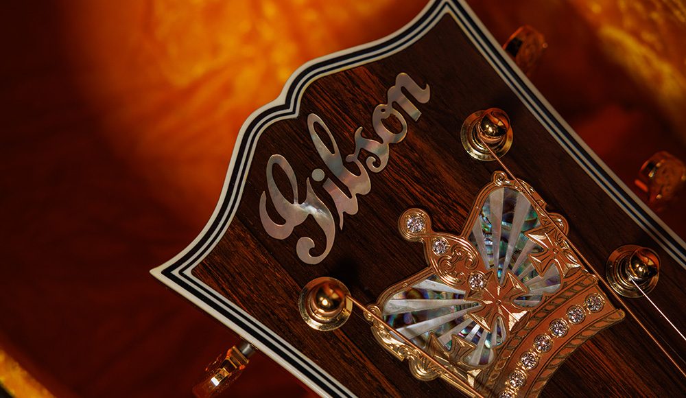 The SJ-200 Monarch 100 is lavishly adorned with intricate mother of pearl and abalone inlays, including the meticulously hand-engraved Monarch crown designs on the fretboard. Its four-bar Brazilian rosewood Moustache™ bridge features abalone inlays bordered in solid 18K gold, while the headstock showcases a mother of pearl Gibson script logo and a sculpted truss rod cover inlaid with both mother of pearl and abalone. On the back of the headstock, a Brazilian rosewood veneer is framed with multi-ply binding and a volute, and it bears a mother of pearl arrow inlay engraved with the serial number and “No. 100” to mark its place as the 100th Monarch ever made. The top of the body is bordered with multi-ply rope binding filled with 14K gold—the first time this detail has appeared on a production model—while the rest of the body is trimmed with double-width abalone purfling, including decorative “sideburns” at the neck heel.