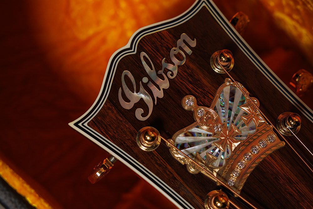 The iconic SJ-200 pickguard is crafted from celluloid tortoise material, machine-engraved and accented with an abalone border and dot inlays. Four natural diamonds, each weighing 0.1 carat, are set into the pickguard within solid 18K gold bezels, adding a touch of brilliance. The guitar is fitted with engraved gold Waverly open-gear tuners, while the nut and saddle are made from bone. The bridge pins, plated in 18K gold over brass, also feature 0.1-carat natural diamond inlays. To protect this regal instrument, a custom-designed Gibson Custom Monarch 100 hardshell case is included—thoughtfully crafted by the master luthiers and artisans in Bozeman, Montana, to reflect the guitar’s one-of-a-kind status and ensure it remains safe and secure.