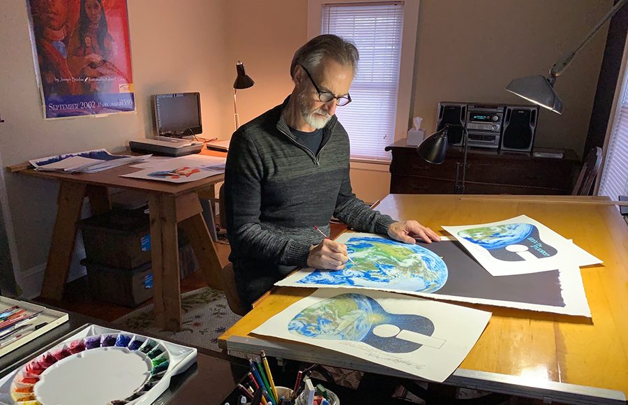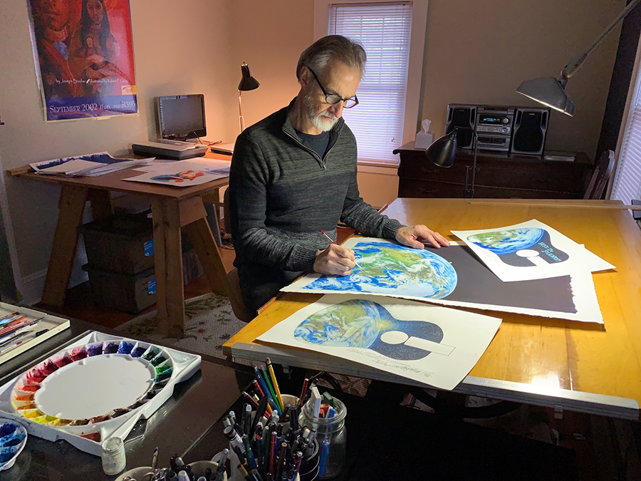 The movement fanned a flame in Goetzl that had been slowly burning for many years. He wanted to use his talent to become part of the solution, so he immediately dropped what he was doing and painted a watercolor of the earth. His hope was that it would one day adorn the top of a Martin guitar that could be used to bring awareness to the urgent need for climate action.