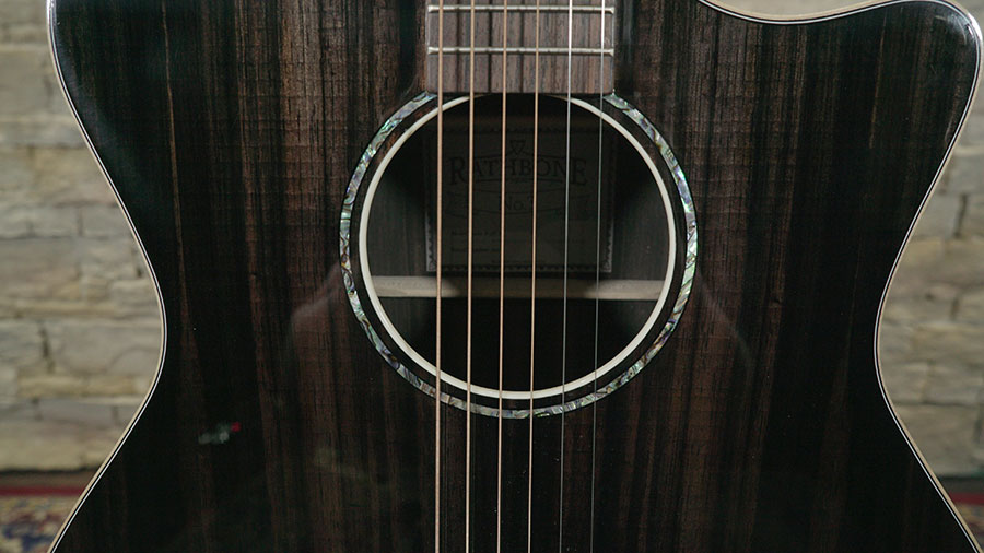The R3ECE Rathbone Grand-Auditorium ‘Double Top’ features a technologically advanced sound-table made of two super-thin layers of Ebony with a Carbon Fibre lattice in-between.