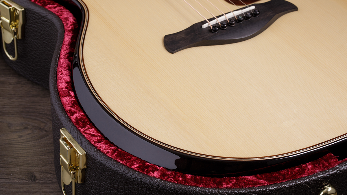 Comfort-enhancing woodworking details set the Builder’s Edition 814ce apart from its standard-model counterpart. A beautifully sculpted beveled cutaway ensures effortless high-register access, while a beveled mahogany armrest provides a smooth surface for the player’s strumming arm. The guitar is voiced with a specially modified V-Class bracing pattern and includes slight alterations in the taper of the body. It’s also the only model in the Builder’s Edition collection to feature a gloss-finish body, an aesthetic touch that visually highlights the elegant body contouring and craftsmanship.