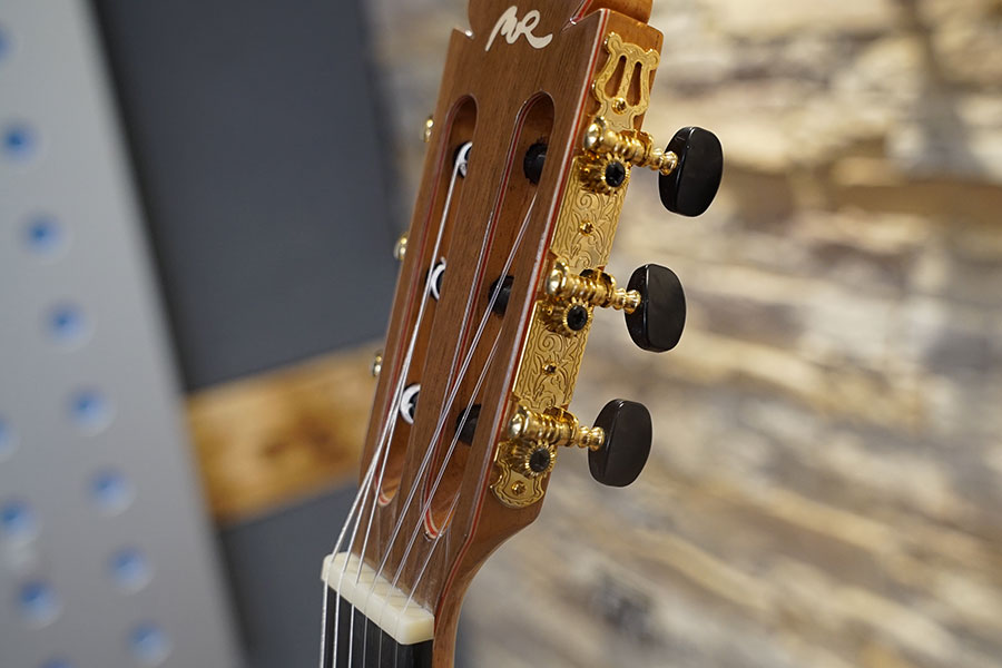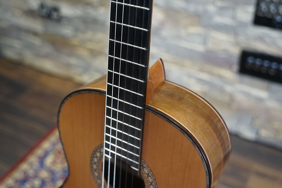 Original Spanish neck heel, light CEDRO neck with ebony inlay and the combination of sprayed shellac (french varnish) for the top and natural, water-based eco-high gloss lacquer for back and sides are unique!”