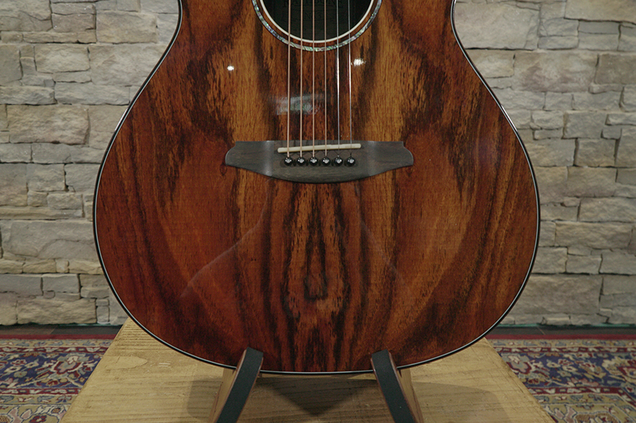 Rathbone says...”Traditional aesthetics meet 21st Century technology. The R3BCE Rathbone Grand-Auditorium ‘Double Top’ features a technologically advanced sound-table made of two super-thin layers of Bocote with a Carbon Fibre lattice in-between. This ‘Double-Top’ construction enables the sound-table to be a little thinner than a single solid piece of bocote but remain strong and ultra-responsive. The result is a super-resonant and voluminous guitar with bags of both character and all-out power. The highly figured all-Bocote tonewoods offer a mesmerising marbled grain while delivering a warm and articulate tone with superb projection.
