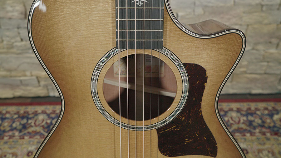 Taylor says...”The 512ce is one of our first models to feature back and sides of solid Urban Ironbark, a dense, hard tonewood that yields a rich, sophisticated response with a deep low end and high-fidelity voice reminiscent of Indian rosewood, along with some of mahogany’s midrange punch and focus. The Grand Concert 512ce pairs Urban Ironbark with a torrefied Sitka spruce top, lending a played-in character that makes for a warm, piano-like sound with remarkable balance across the tonal spectrum. With V-Class bracing inside, this compact acoustic-electric serves up room-filling projection and blooming sustain, offering a muscular quality that remains sensitive to a soft touch. Appointments include new Aerial inlays in Italian acrylic, a single-ring abalone rosette trimmed with maple and black purfling, and a tastefully subtle edgeburst. It ships with ES2 electronics in a deluxe hardshell guitar case.”